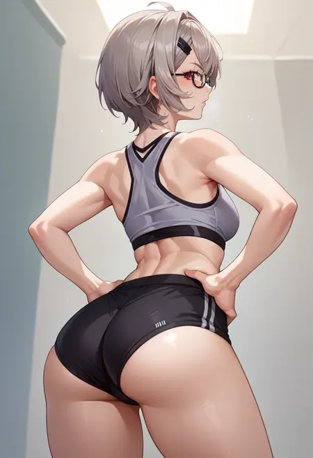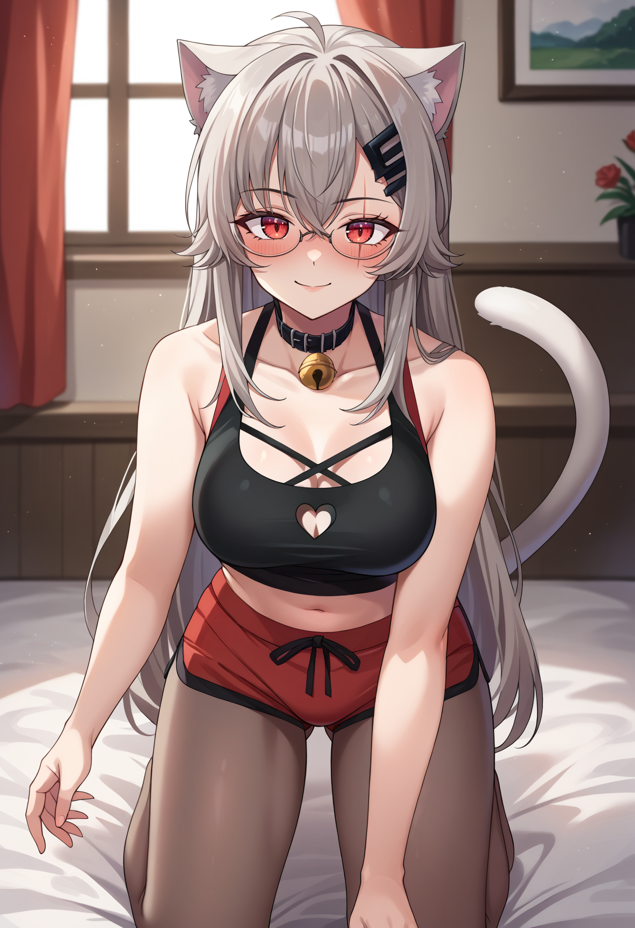 SarueiCasual, grey hair, animal ears, glasses, scar across eye, long hair, hairclip, black collar, neck bell, black tank top, heart cutout, cleavage, midriff, red shorts, black pantyhose, cat tail