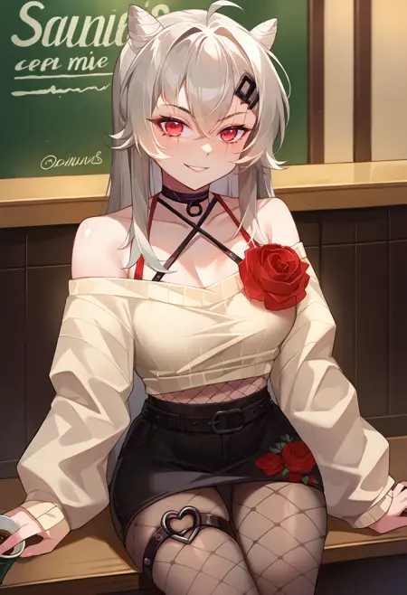 SarueiValentine, grey hair, scar across eye, long hair, cone hair bun, hairclip, black choker, criss-cross halter, grey sweater, off-shoulder, red rose, fishnets, black skirt, tight skirt, flower print skirt, brown pantyhose, print pantyhose, thigh strap