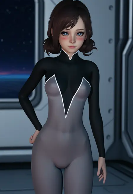 스페이스 바디수트 "짧은 머리, 검은색 및 회색 바디수트, 더블 번"