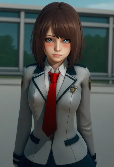 학교 유니폼 "자켓, 짧은 머리, 학교 유니폼, 빨간 넥타이, 주름치마, 흰 셔츠, 앞머리"
