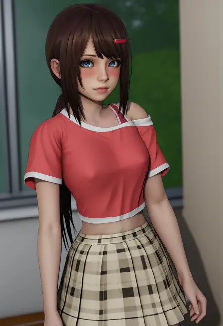 어깨 드러낸 치마 "복부, 짧은 소매, 앞머리, 긴 머리, 체크무늬 치마, 어깨 드러낸 핑크 셔츠, 빨간 머리클립"