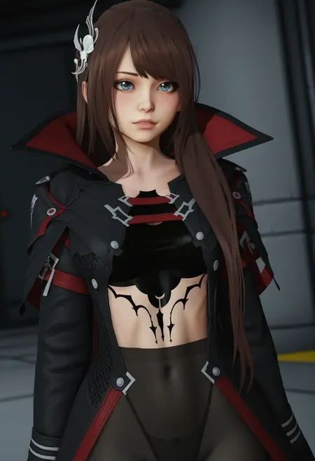 Eternum 재킷 "긴 머리, 배꼽, 복부, 검은 스톡스, 긴 검은 코트, 검은 튜브탑, 흰 머리 장식, 검은 장갑, 하이레그 검은 팬티"