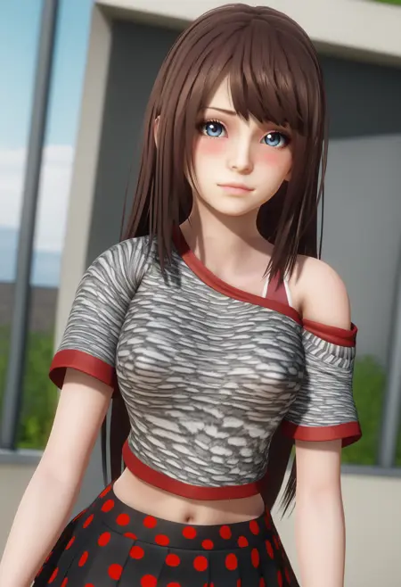 폴카닷 치마 "스톡스, 복부, 배꼽, 검은 치마, 긴 머리, 폴카닷 치마, 어깨 드러낸 회색 셔츠, 짧은 소매"
