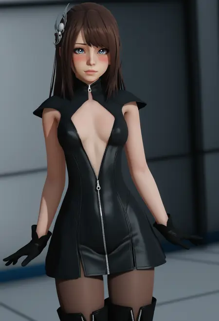 Eternum 지퍼 드레스 "검은 장갑, 스톡스, 허벅지 부츠, 머리 장식, 앞머리, 검은 지퍼 드레스"
