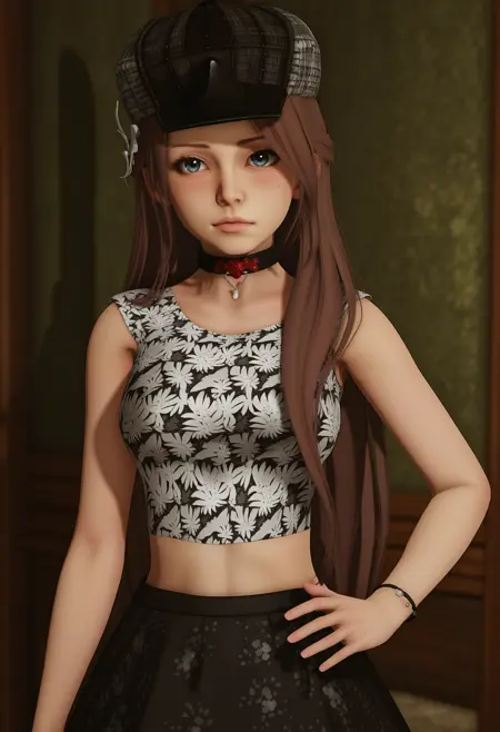 디어스택러 "긴 머리, 복부, 검은 치마, 흰색 크롭탑, 플로럴 프린트, 검은색 및 빨간색 초커, 흰색 머리 장식, 디어스택러 모자"