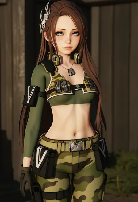 군복 "배꼽, 복부, 흰색 머리 장식, 긴 소매, 캐머플라지 크롭탑, 캐머플라지 바지, 유틸리티 벨트, 허벅지 홀스터, 가슴 파우치, 검은 장갑, 개 목표"
