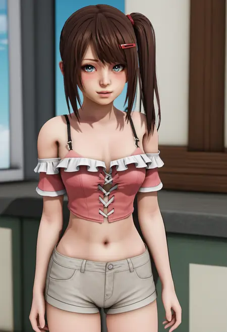 핑크 크롭탑 "배꼽, 복부, 긴 머리, 어깨 드러낸 스타일, 어깨 노출, 핑크 크롭탑, 회색 반바지, 빨간 머리클립, 브라 스트랩, 사이드 페일, 앞머리"