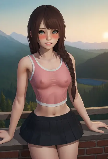 露肩裙装 "露腹,短袖,刘海,长发,格子裙,露肩粉红上衣,红色发夹"
