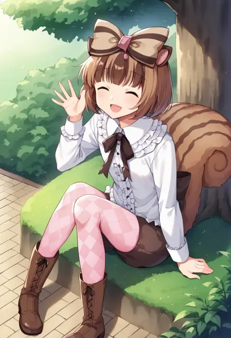 갈색 눈, 단발, 갈색 머리, 다색 머리, 헤어 리본, 동물 귀, 다람쥐 꼬리, 다람쥐 귀, 리본