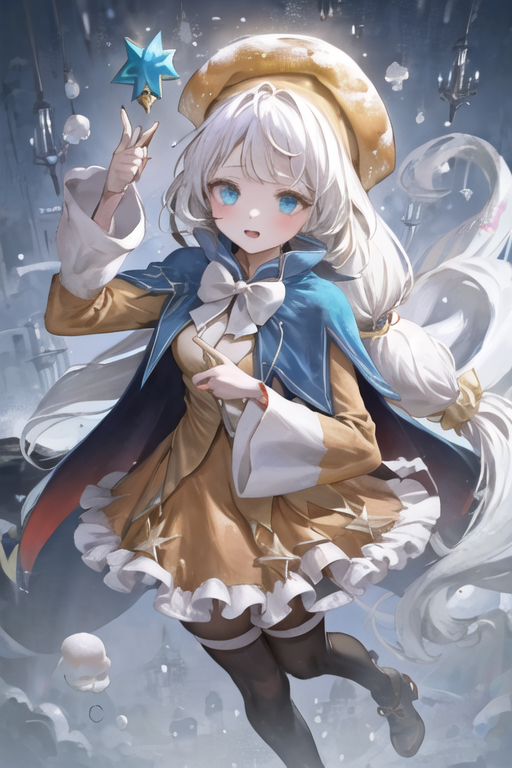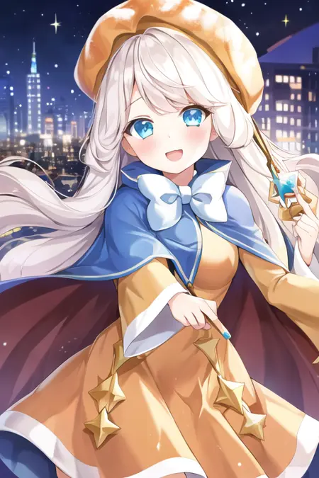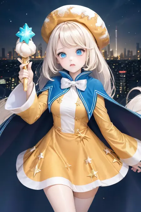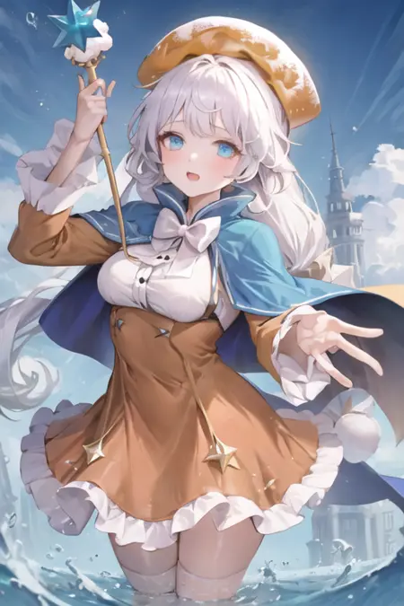 使用 crkcreampuff 召唤她,使用 蓝色眼睛、长发、白发、黄色头饰 组成她的头部,使用 橙色连衣裙、蓝色斗篷、宽袖、蝴蝶结、领结 召唤她默认的服装,使用 魔杖 召唤她的魔杖。