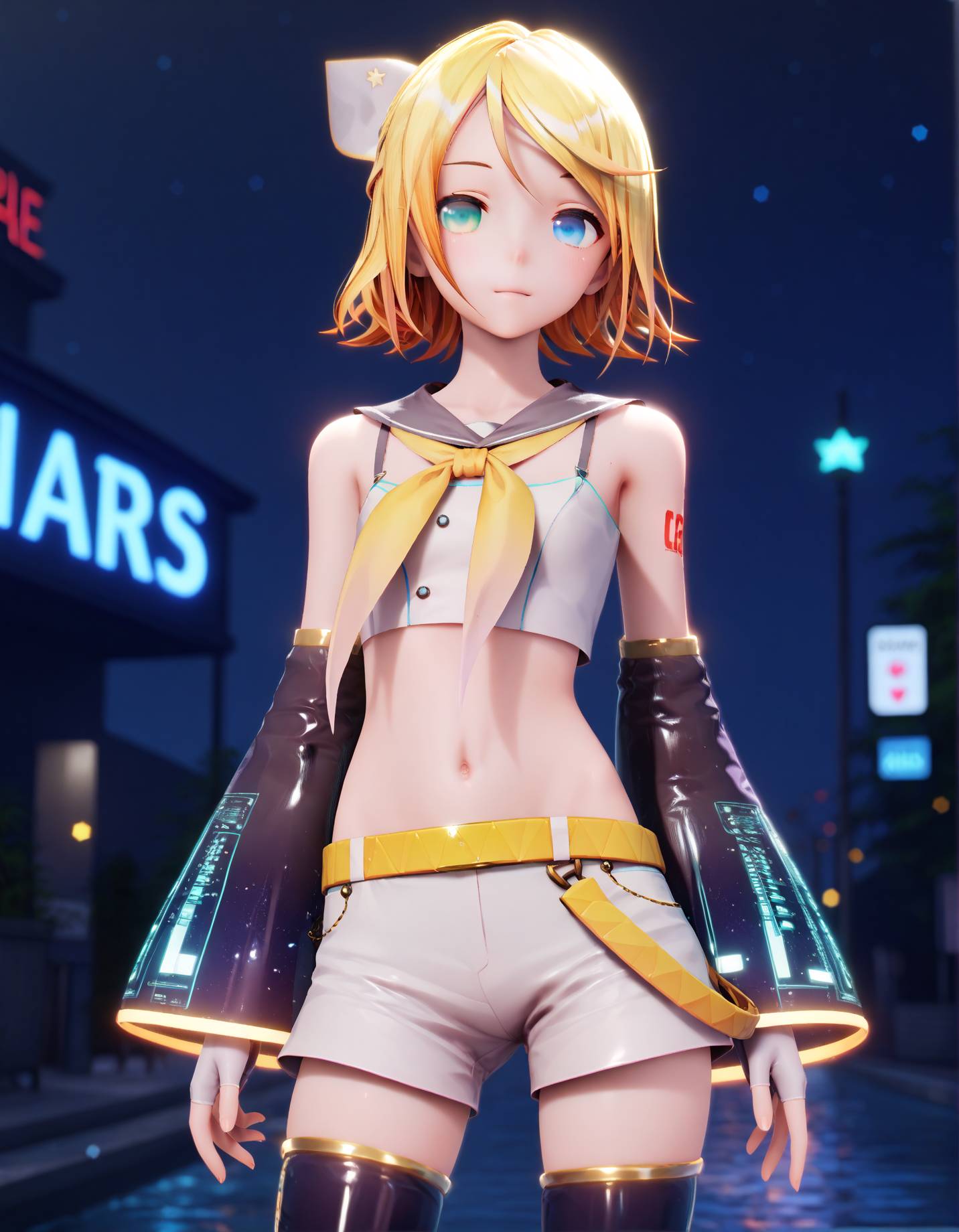 リン:1girl, yybrin, デタッチド袖, デタッチドレギンス, ネッカチーフ, セーラー襟, シャツ無袖, 短パン, 異色瞳, 片腕のタトゥー, ベルト, フィンガーレスグローブ