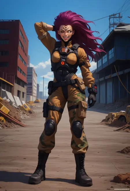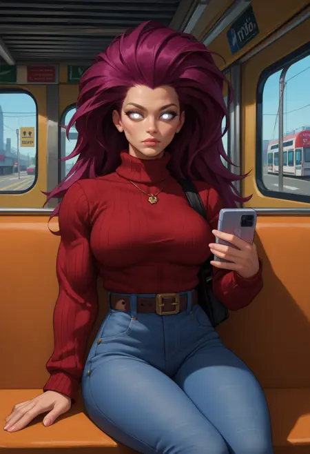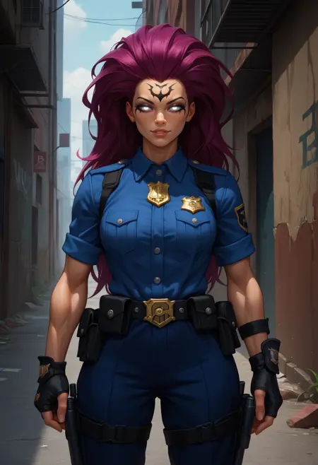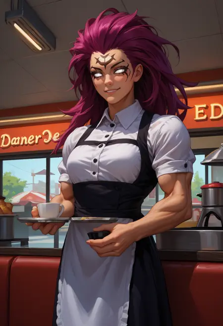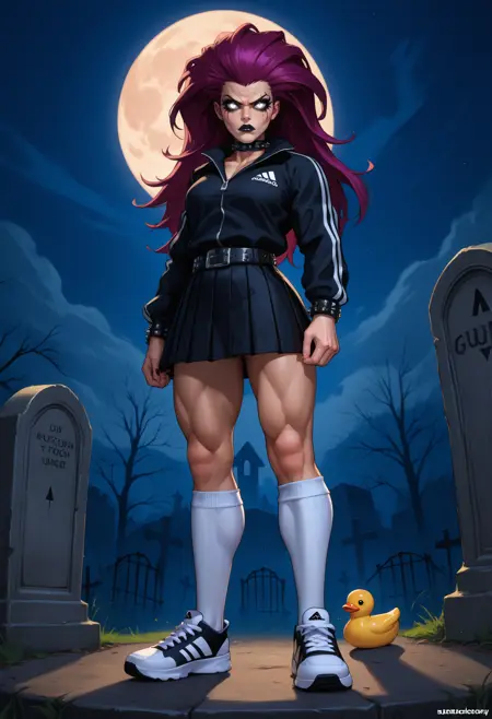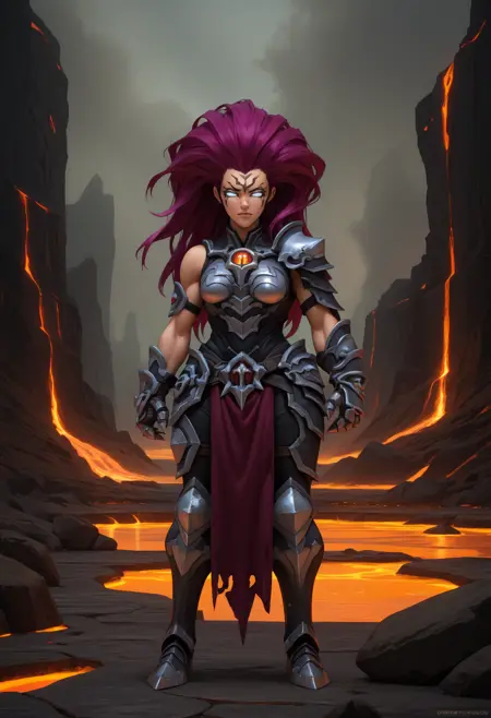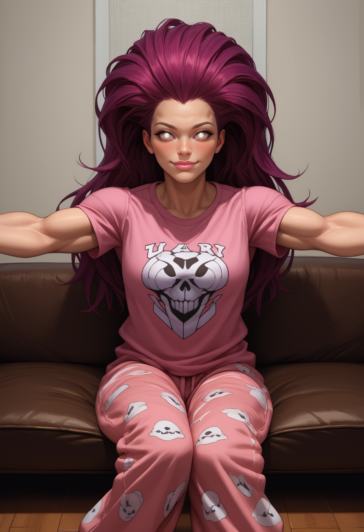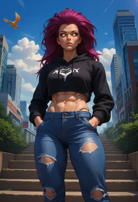 long hair, glowing eyes, white eyes, no pupils, purple hair, toned, muscular, muscular female,