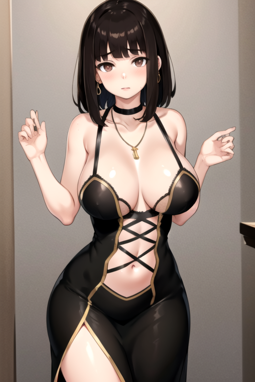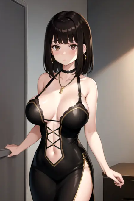 | 训练词汇 | AudreyBC, 1girl, solo, medium hair, large breasts, brown hair, black hair, black dress, navel, cleavage, bare shoulders, brown eyes, jewelry, collarbone, earrings, sleeveless, black choker, blunt bangs, necklace, long dress, plunging neckline已复制! |