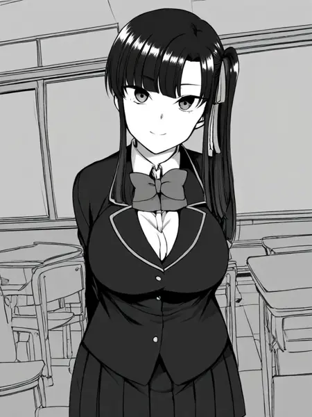 宮島 樱: miyajima sakura, 黑发, 不对称刘海, 侧马尾, 大胸