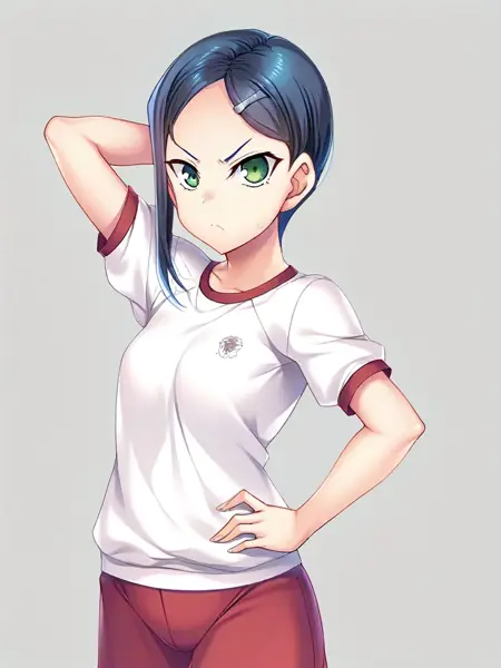 藤井 夏树: fujii natsuki, 短发, 不对称浏海, 绿瞳, 小胸, 深蓝色头发, 发夹