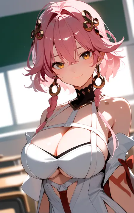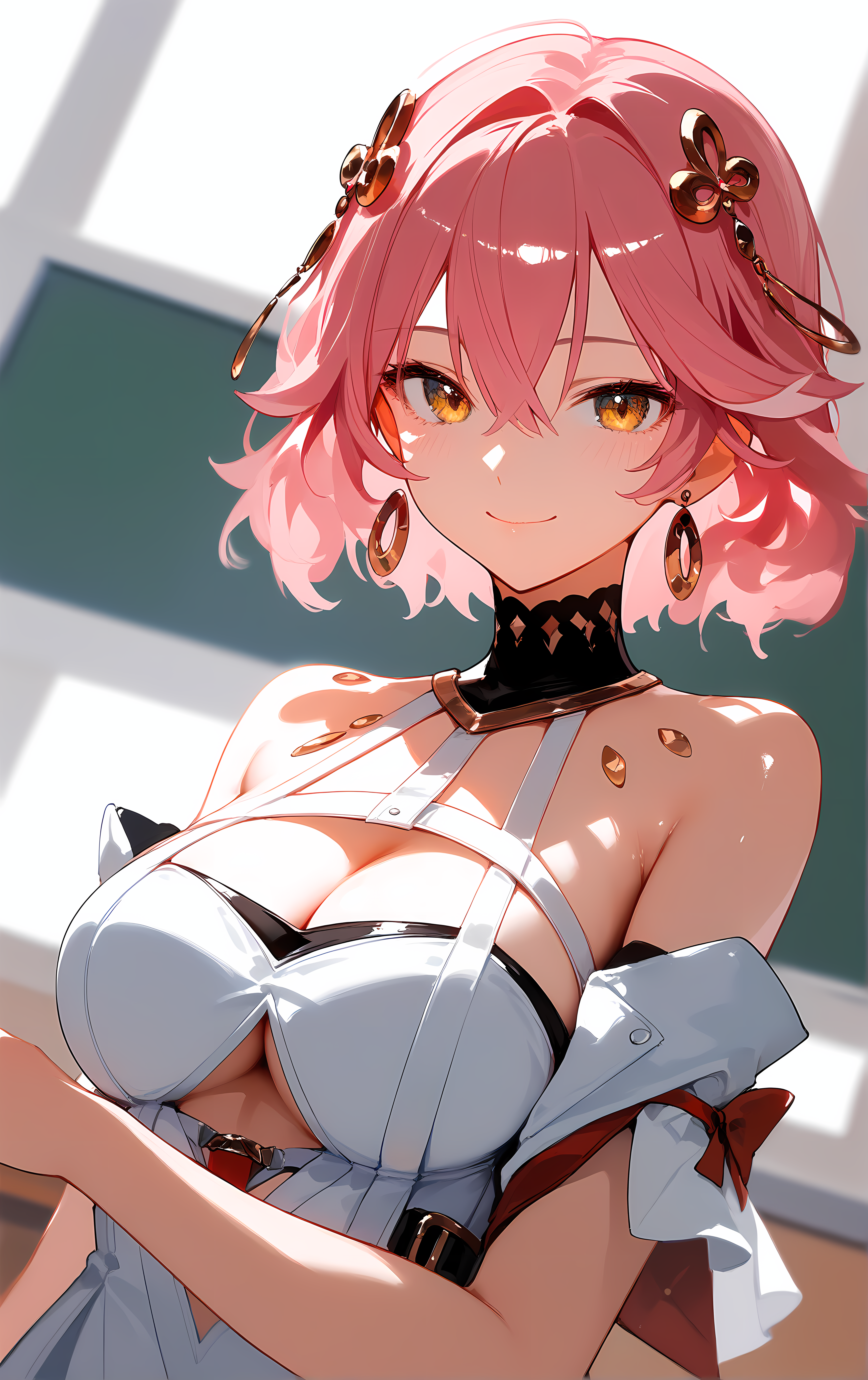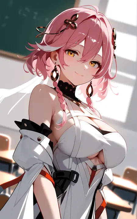 cha, 1girl, breasts, solo, pink_hair, thighhighs, long_hair, dress, black_thighhighs, black_footwear, yellow_eyes, white_dress, full_body, high_heels, bare_shoulders, jewelry, hair_ornament, earrings, hair_between_eyes, cleavage, detached_sleeves, thighs,