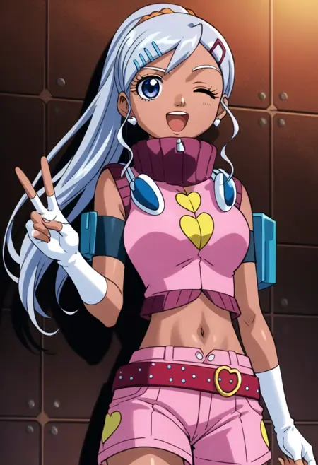提示文本:bakugan,julie makimoto, dark skin, dark-skinned female,midriff, hairclip,navel,hair ornament,long hair,belt,gloves,ponytail,white hair,breasts,fingerless gloves