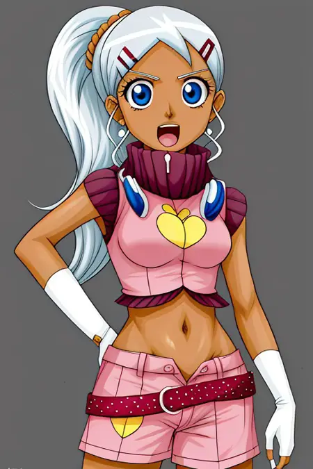 prompt text:bakugan,julie makimoto, dark skin, dark-skinned female,midriff, hairclip,navel,hair ornament,long hair,belt,gloves,ponytail,white hair,breasts,fingerless gloves