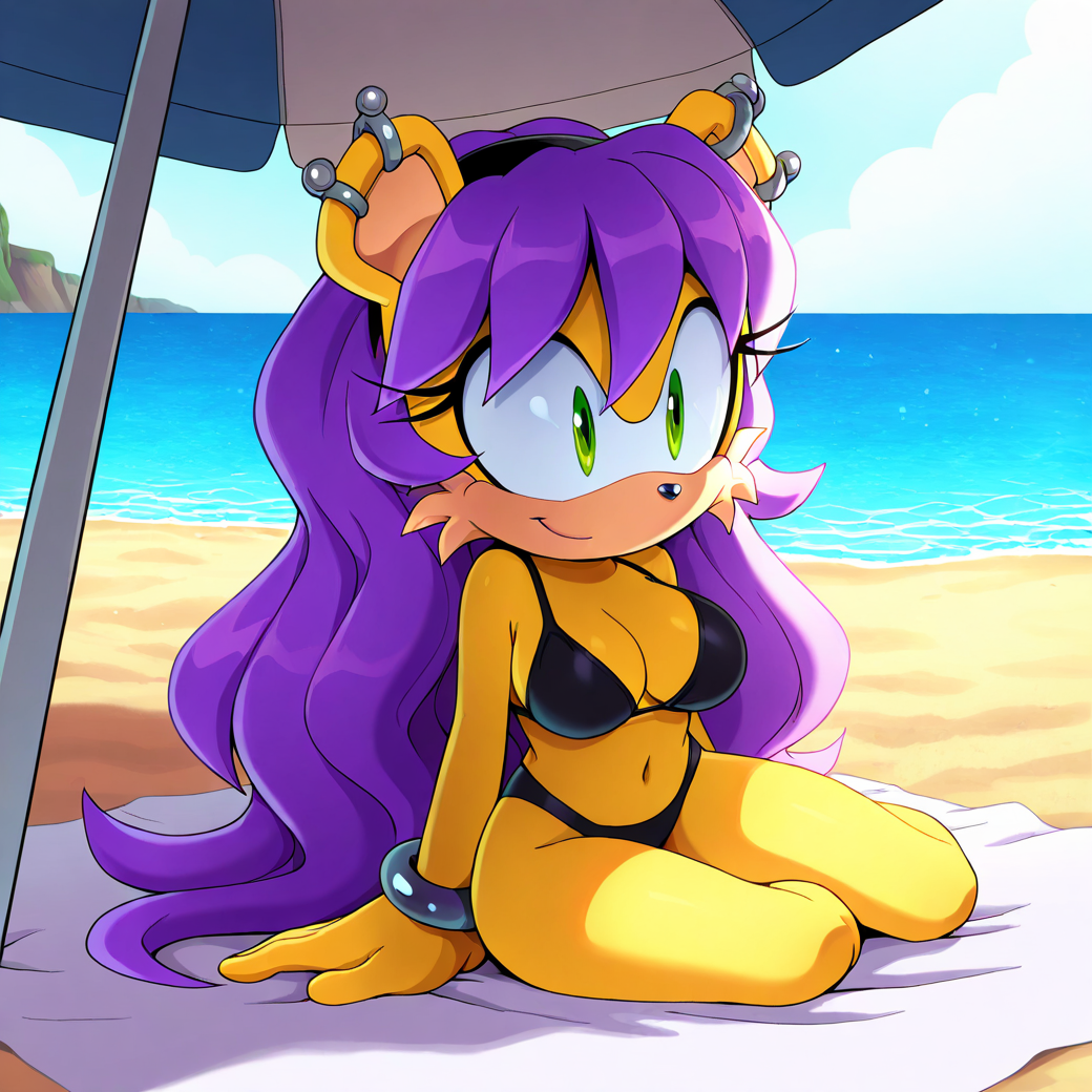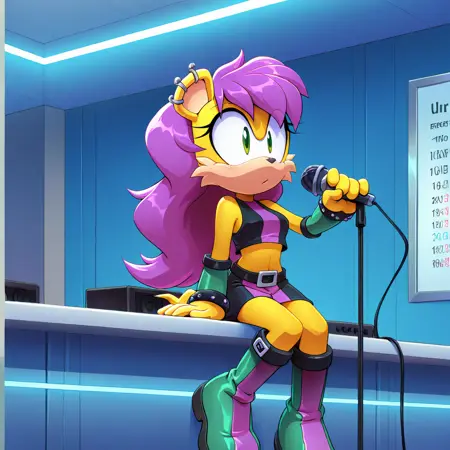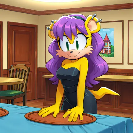 TAGS: mina mongoose, yellow fur, furry female, bodyfur, green eyes, purple hair, earrings