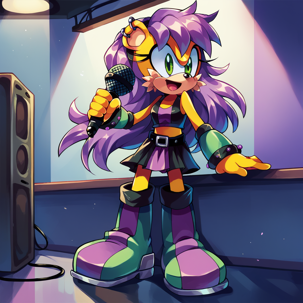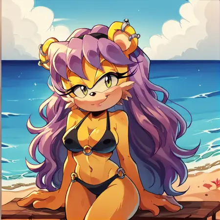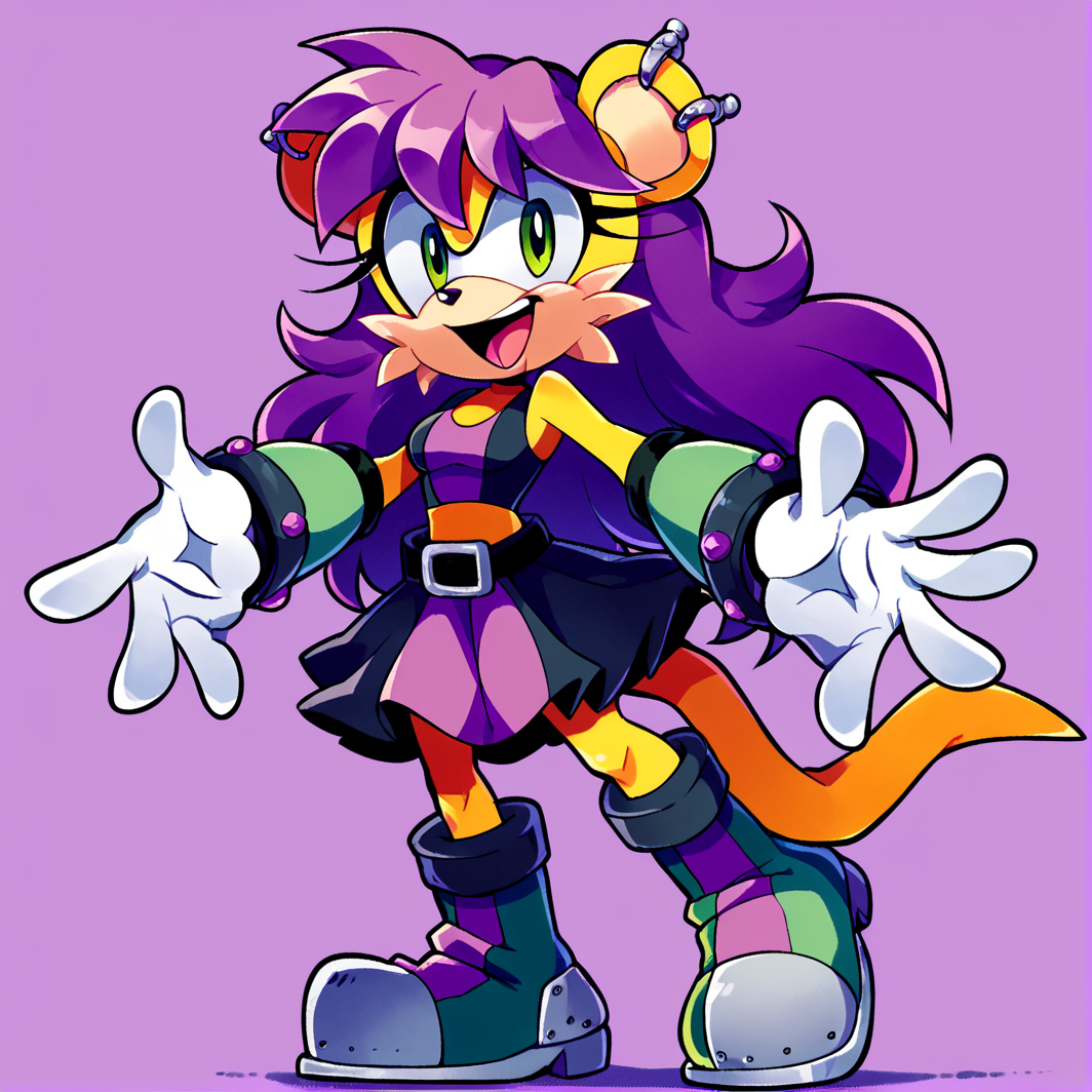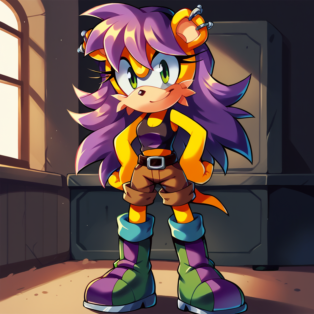 TAGS: mina mongoose, yellow fur, furry female, bodyfur, green eyes, purple hair, earrings