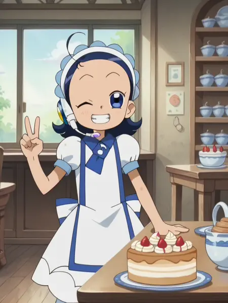 • Pastry Chef Clothes: patsenoai, short hair, blue hair, ahoge, blue eyes, dress, headset, puffy short sleeves, headphones, bow, maid headdress,boots