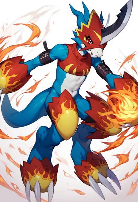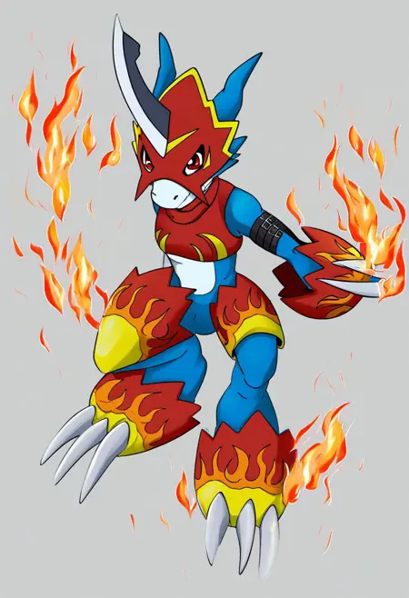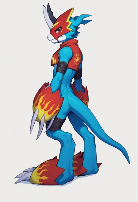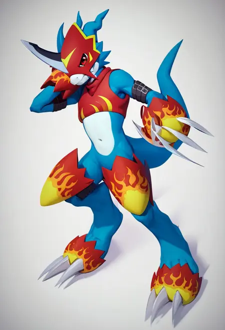 flamedramon, furry, blue skin, red eyes,