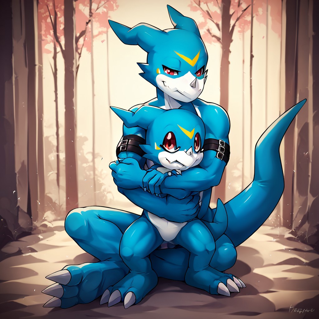 flamedramon, furry, blue skin, red eyes,