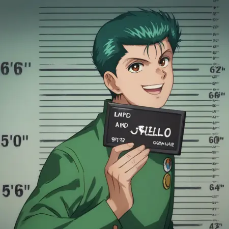 ken mugshot, holding, nameplate, holding sign, letterboxed, looking at viewer, open mouth, smile, upper body, mugshot, english text,