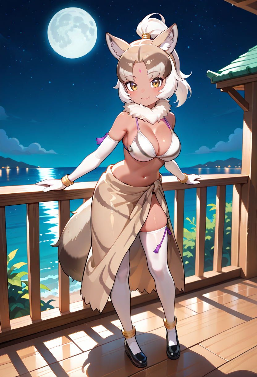 [Appearance] indian wolf \(kemono friends\), wolf girl, animal, wolf ears, animal ears, animal ear fluff, wolf tail, tail, tan, dark skin, dark-skinned female, multicolored hair, two-tone hair, white hair, blonde hair, brown hair, light brown hair, hair ornament, ponytail, high ponytail, bindi, facial mark, forehead mark, yellow eyes, brown eyes, large breasts,
