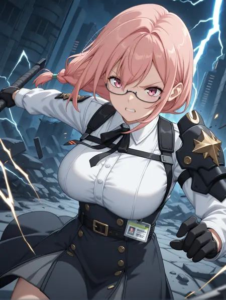 月白柳:yanagi, 粉眼, 粉发, 半框眼镜, 衬衫, 带领子衬衫, 黑色颈带, 肩部护甲, 胸下束带, 腰带, 黑色手套, 员工卡, 高腰裙