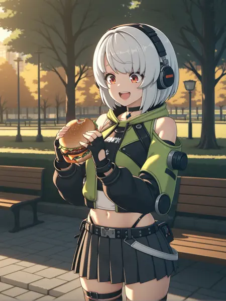 安比:zzzanby, 耳机, 项圈, 分离式袖子, 无袖夹克, 露脐, 无指手套, 腰带, 百褶裙, 大腿绑带, 过膝袜, 内裤带