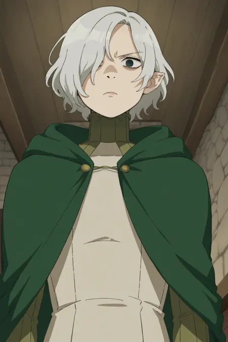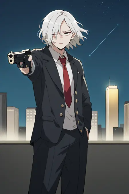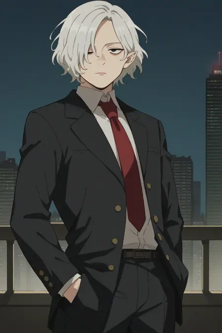 トリガー: KJOmithrun、白髪、((片方の目を半閉じた状態))、短髪、黒目、目の下のクマ、尖った耳、片方の目に髪がかかる