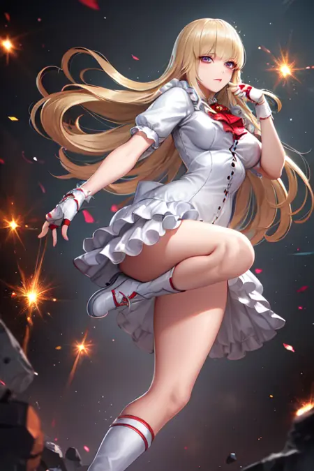 To prompt her Tekken 7 appearance, enter "lora:Liliv1:strengthEmilie T7, white frilled dress, red ascot, fingerless gloves, white boots". To prompt her Tekken 8 appearance, enter "lora:Liliv1:strengthEmilie T8, pink frilled dress, frilled ascot, fingerless gloves, lace-up boots". Lili is partially trained on her ingame appearances as well, to prompt her 3d model appearances, use "3d model".