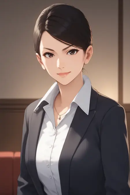 kaoru sayama, black hair, short hair, short ponytails, black eyes, makeup, necklace, suit, black jacket, white shirt, collared shirt, black pants, black footwear