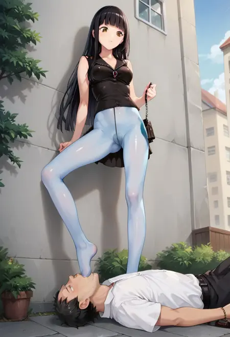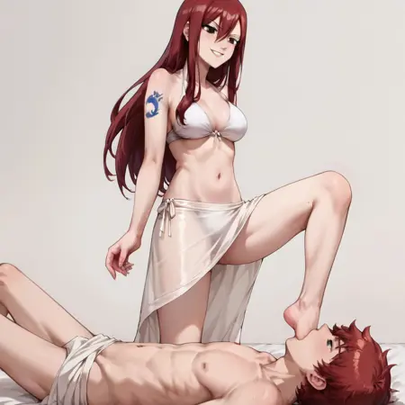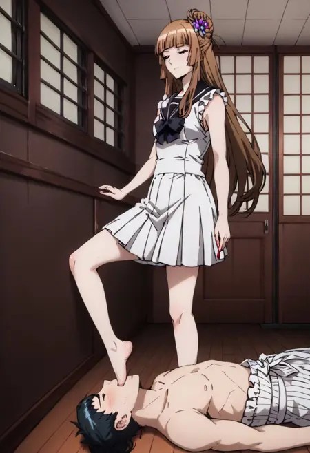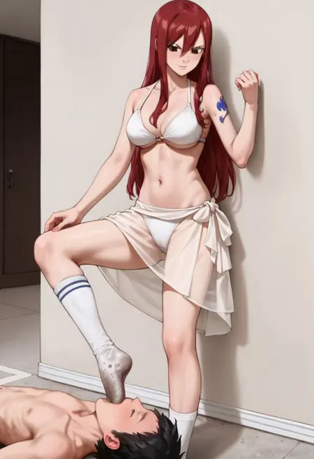 Foot_Gagging, femdom, 1girl (standing one leg), 1guy (submissive, lying on floor)