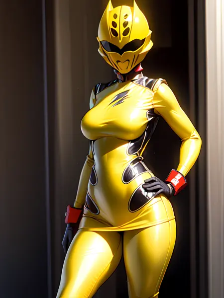 프롬프트: solo, helmet, 1girl, bodysuit, yellow bodysuit, gloves, ,black_visor