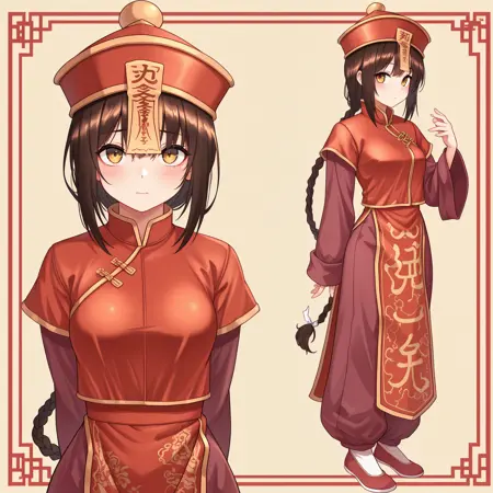 일러스트러스 버전은 제대로 작동하기 위해 더 많은 태그가 필요할 수 있으므로, 완전히 옷을 입고 빨간 눈을 원하신다면 "1girl, MUN4K, 빨간 눈, 갈색 머리, 단일 땋은 머리, 청관모, 오푸다, 넓은 소매, 손목을 넘는 소매, 중국 복장"으로 시작하세요.