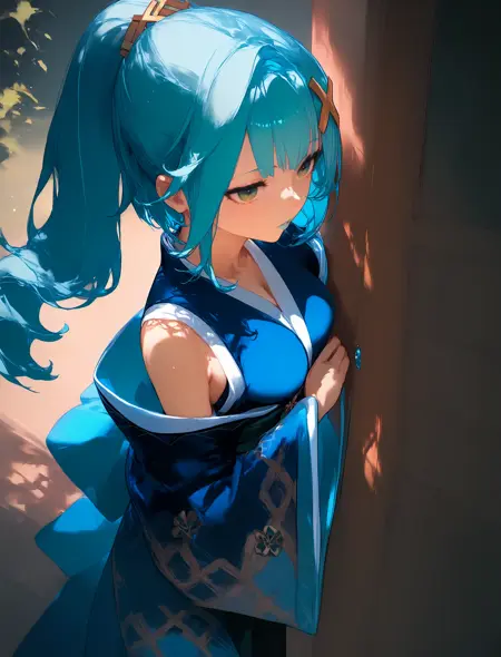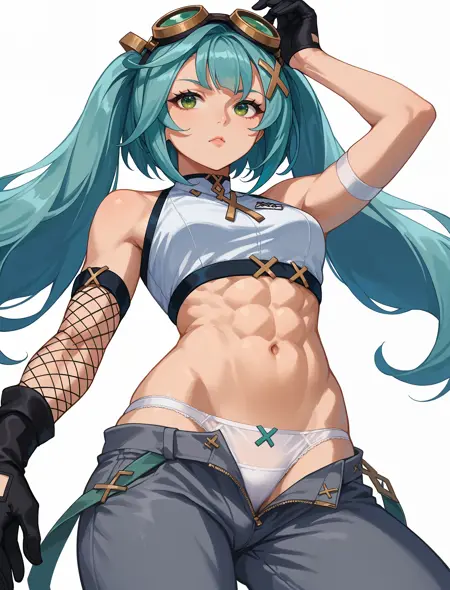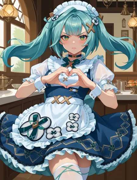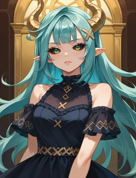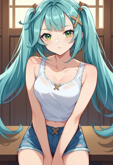 Trigger: wrnchgifrzncafe, long hair, green eyes, x hair ornament, aqua hair, twintails