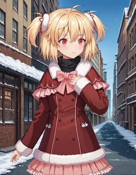 冬季服装: mgrcayanorika, rikawtr, 带蝴蝶结的白色发圈,黑色毛衣,红色冬衣,红色荷叶边短披肩,粉色荷叶边裙子,粉色条纹蝴蝶结领结,黑色过膝袜