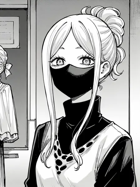 Alt: ichijou michiru, white hair, parted bangs, hair up,