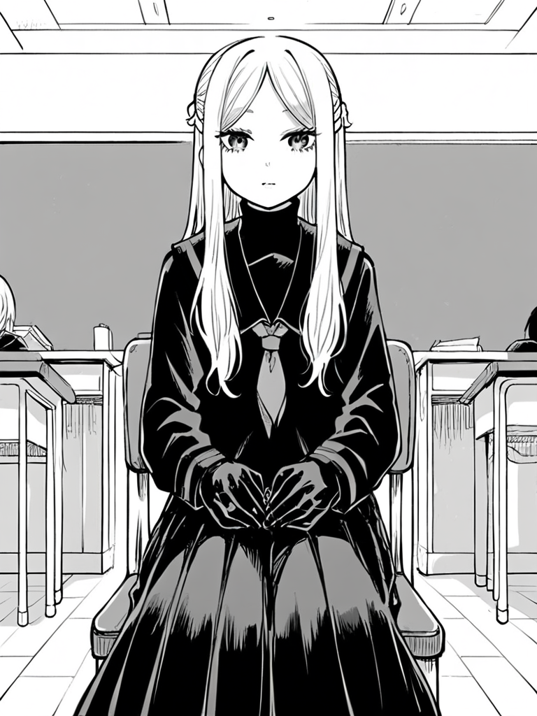 Outfit: turtleneck, school uniform, black serafuku, long sleeves, long skirt, black skirt, black gloves,