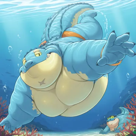 最佳正面输入:(makara, housamo, 蓝黄肤色,拟人化,鳄鱼,肥胖,超重,五趾,黄眼睛)
