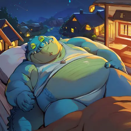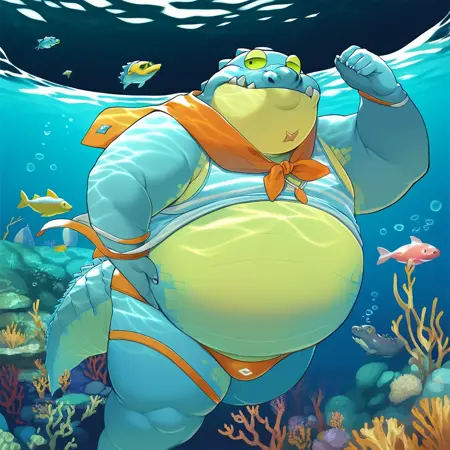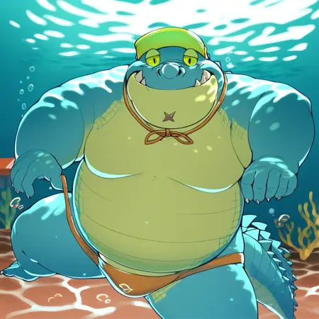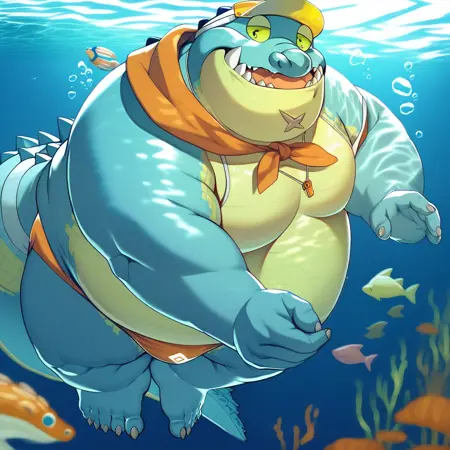 最佳正面输入:(makara, housamo, 蓝黄肤色,拟人化,鳄鱼,肥胖,超重,五趾,黄眼睛)