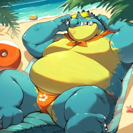Best Positive Input: (makara, housamo, blue and yellow skin, anthro, crocodile, fat, obese, five toes, yellow eyes)