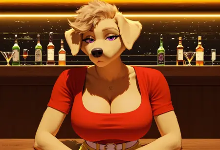 ブロンドの毛並み、ブロンドの体、ブロンドの髪、短髪、紫の目、耳飾り、赤いシャツ、白いベルト、黄色のショーツ、黒い鼻、尾、犬娘、ゴールデンレトリバー、無表情