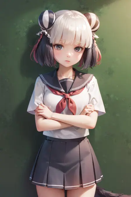触发词 + 外貌特征: haku, 彩色头发, 双丸子头, 双辫子, 尾巴