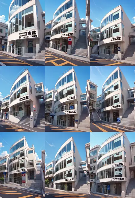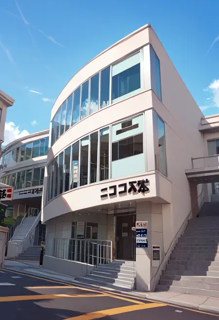 <lora:niconico_Pony_V1:1>niconicohonsya, (three-storey building), blue sky, fence,lamppost, outdoors, power lines, road, scenery, shadow, sign, simple background, sky, stairs, street, traffic light, watermark, wide shot, window ,