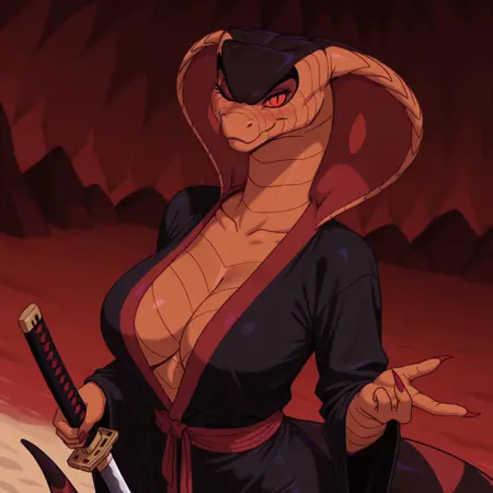 scalie, snake, cobra, feral, snake hood, reptile, black body, black scales, red body, red scales, fangs, teeth, forked tongue, red eyes