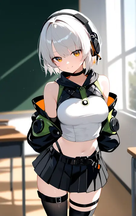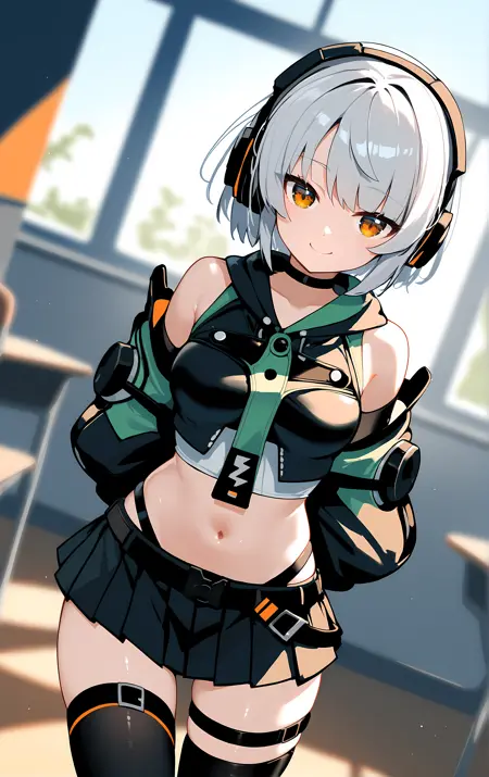 anby, 1girl, solo, skirt, thighhighs, gloves, navel, black_skirt, short_hair, fingerless_gloves, headphones, bare_shoulders, black_gloves, midriff, pleated_skirt, black_thighhighs, white_hair, jacket, miniskirt, thigh_strap, black_jacket, crop_top, choker, long_sleeves, belt, detached_sleeves, orange_eyes, black_choker, stomach, hood, shirt, sleeveless, zettai_ryouiki,