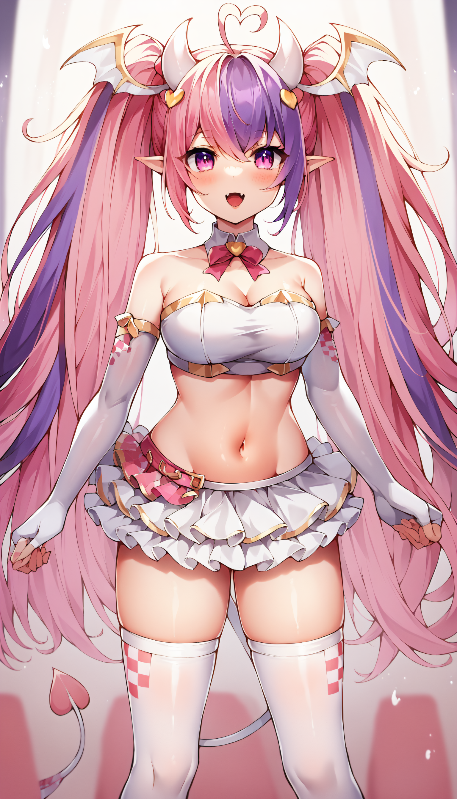 긍정적 프롬프트: sbdfrvffopof, 손가락 없는 장갑, 팔꿈치 장갑, 흰색 장갑, 체크 무늬 옷, 프릴 스커트, 레이어드 스커트, 흰색 스커트, 흰색 히그, 악마 꼬리, 작은 뿔, 트윈테일, 가슴, 배꼽, 보라색 눈, 핑크 하트 머리 장식, 복부, 분홍색 눈, 뾰족한 귀, 흰색 머리 날개, 흰색 :3 머리장식, 분리된 칼라, 활, 흰색 튜브 탑, 황금 장식, 핑크 상패 리본, 하트, 단일 사이드록